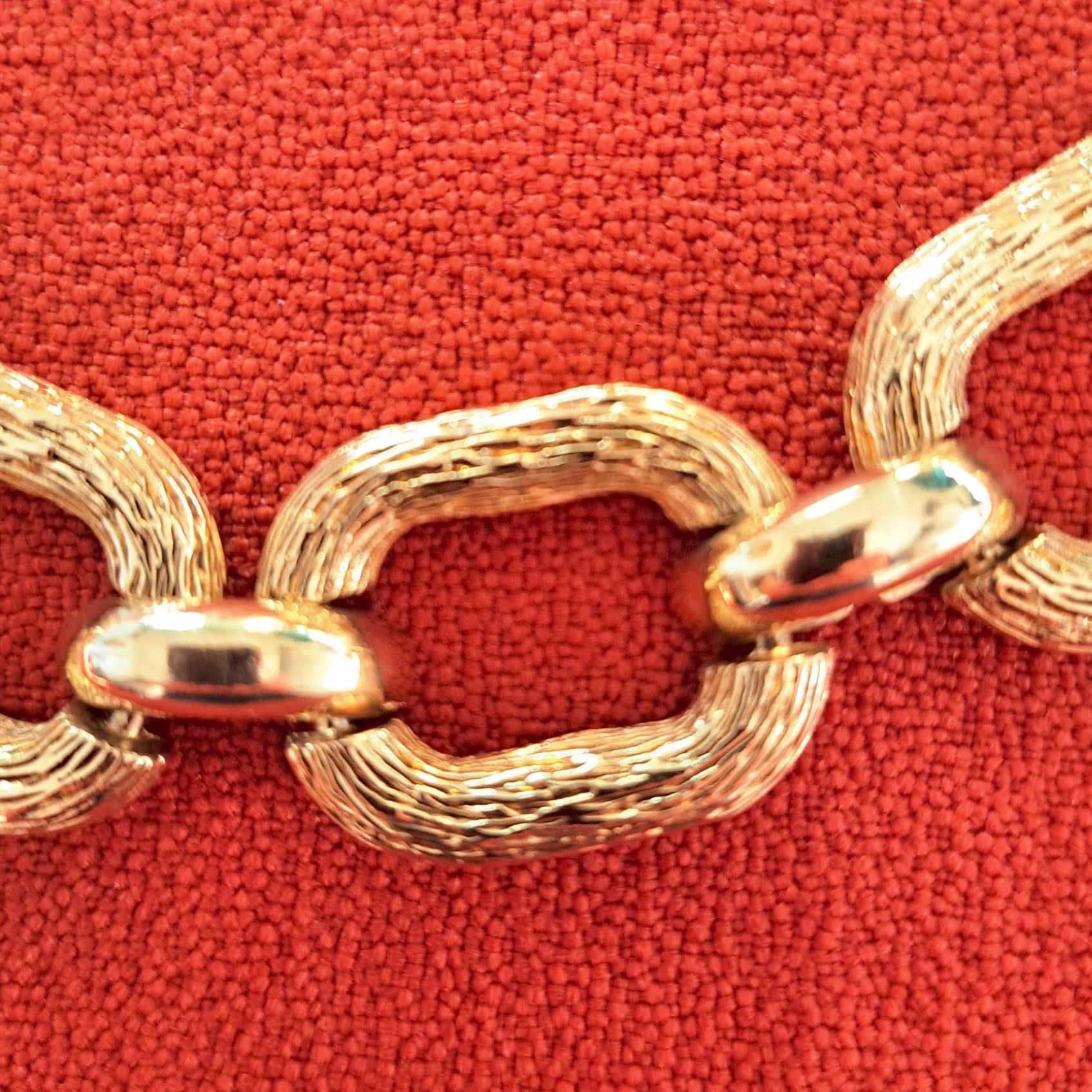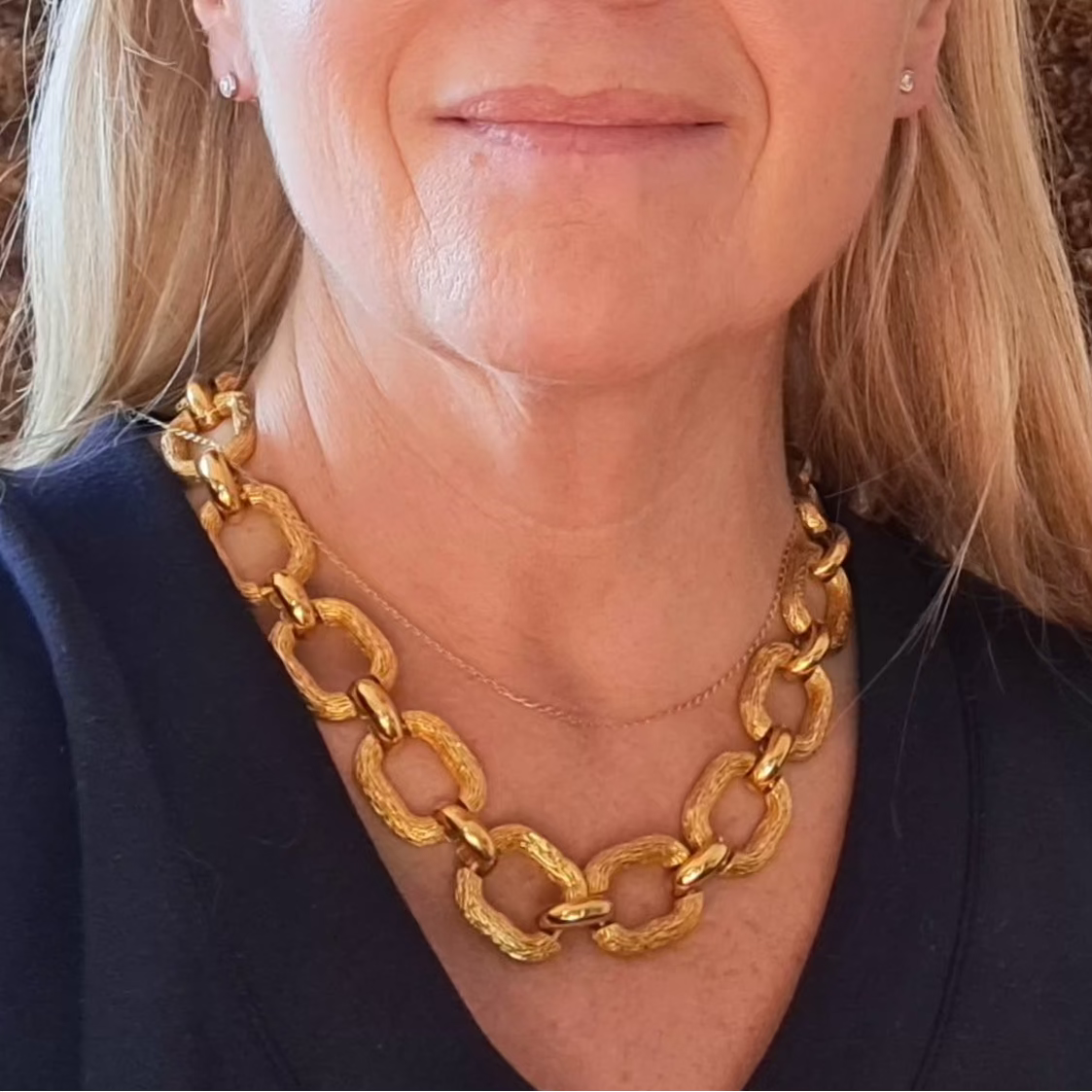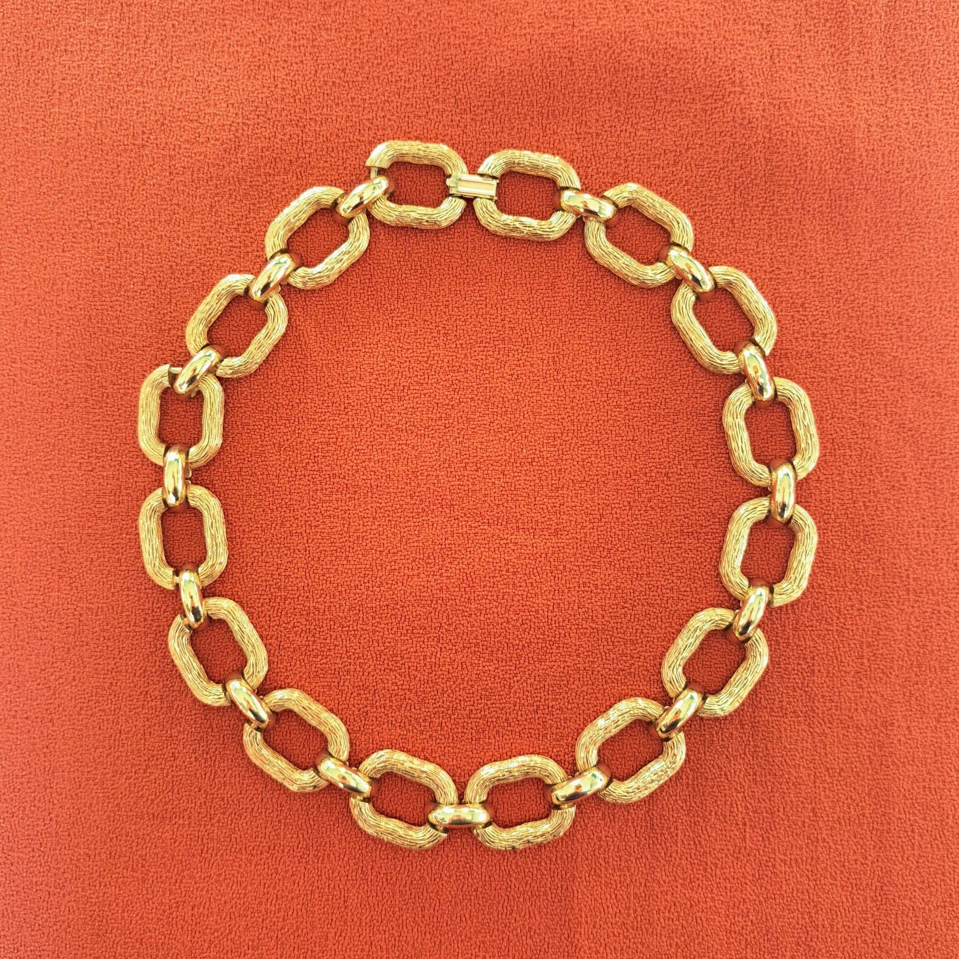Superbe ras-de-cou vintage au design puissant et élégant, composé de larges maillons rectangulaires texturés, reliés par des anneaux plus fins et polis.