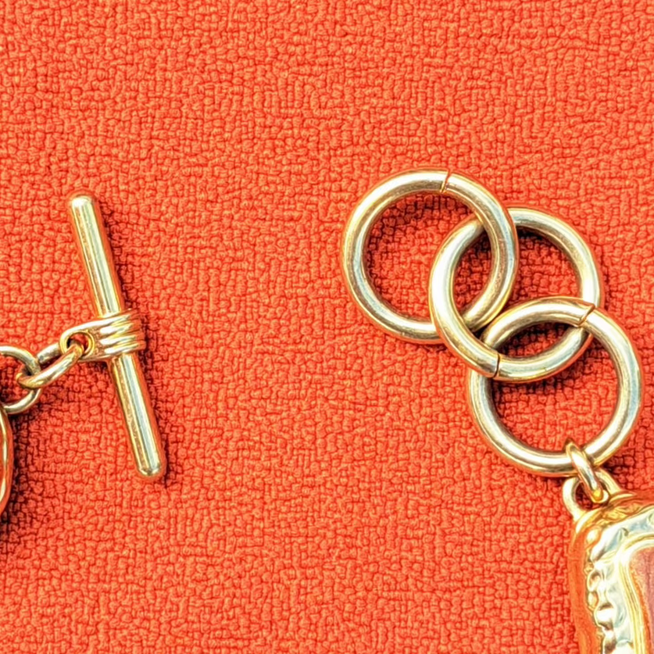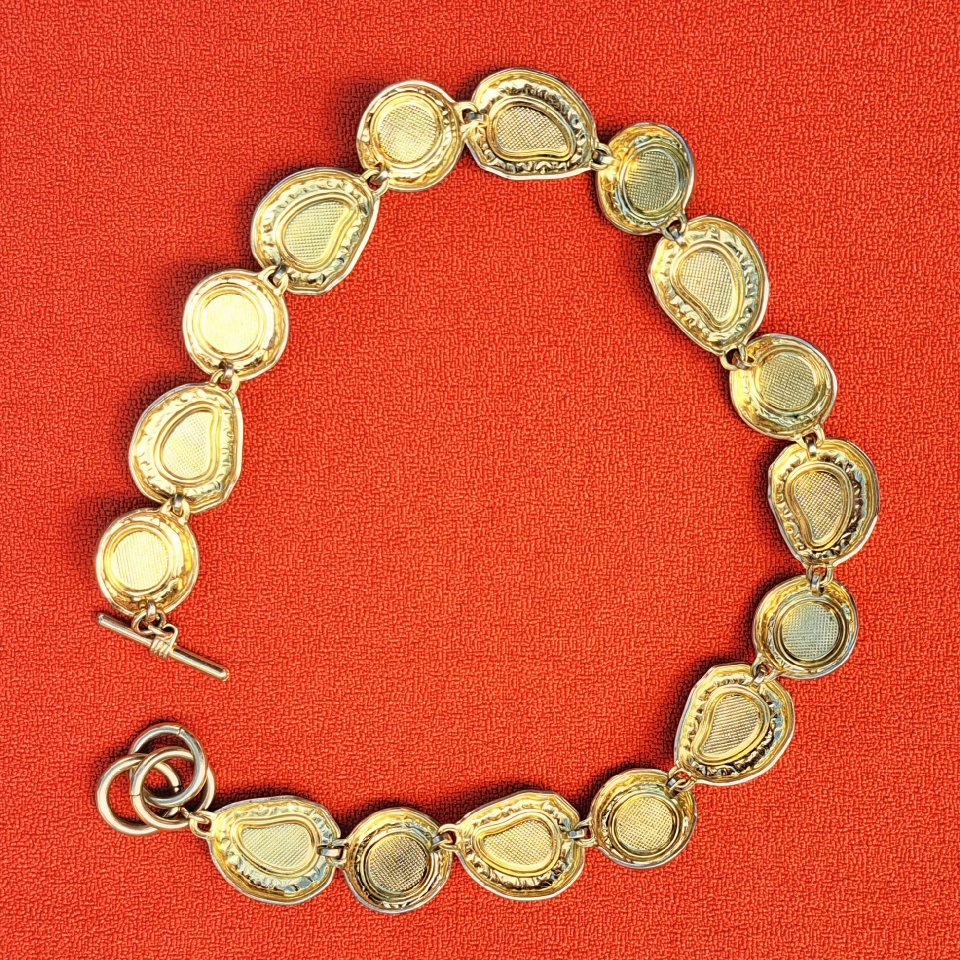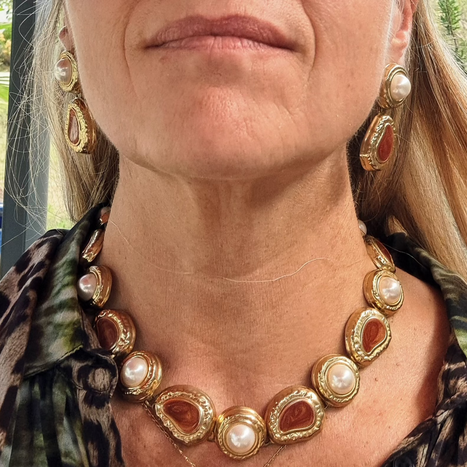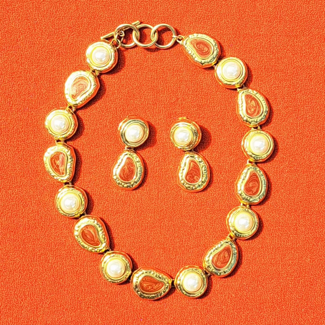 Ajoutez une touche rétro chic à votre look avec ce collier vintage des années 80-90. Les cabochons corail et marron marbré alternent avec de délicates perles crème sur une base dorée, créant un bijou élégant. Possibilité de compléter avec les boucles d’oreilles assorties (vendues séparément).