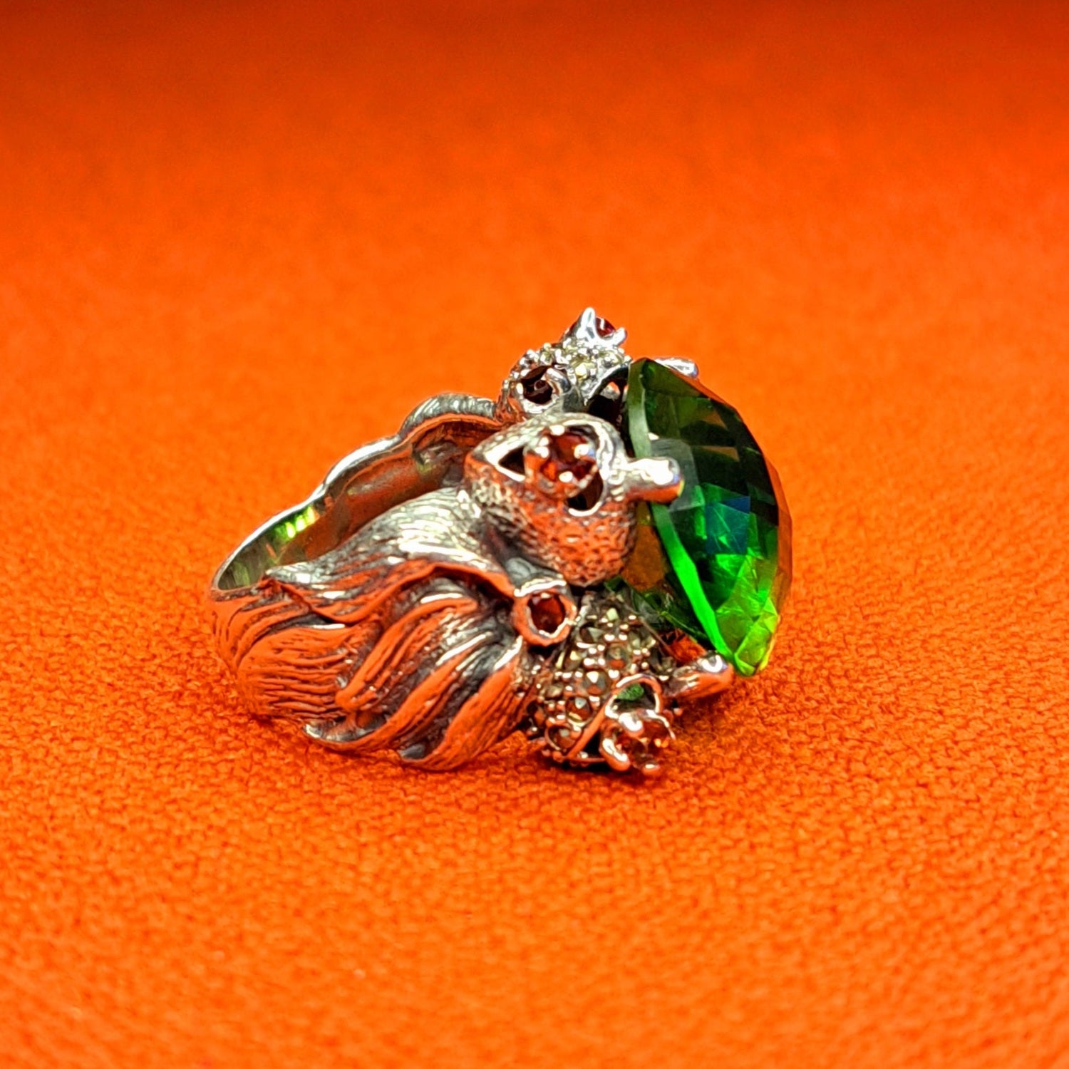 Superbe bague vintage en Argent 925 ornée d'une grande pierre verte facettée. L'anneau est décoré de petits cœurs et de pierres en verre orange. Un bijou coloré et élégant avec de jolis détails.